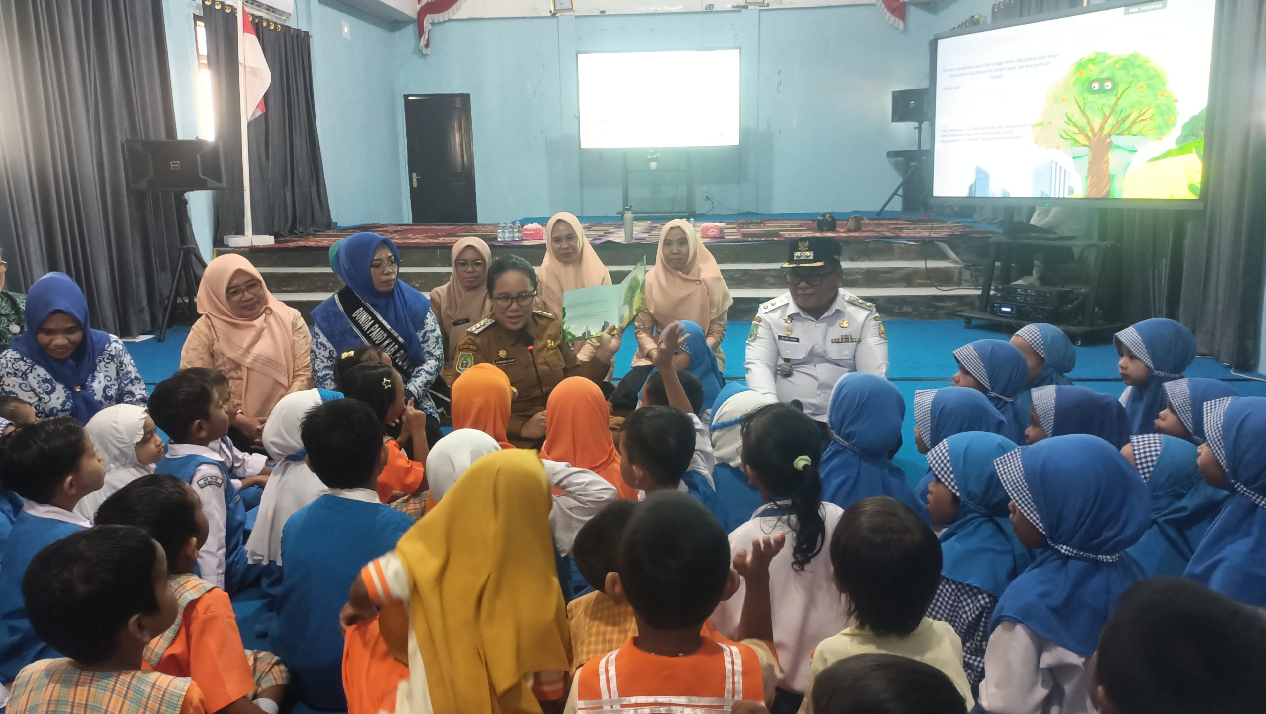Dalam kegiatan tersebut, Bupati didampingi Wakil Bupati dan turut berinteraksi langsung dengan para peserta didik. Suasana berlangsung hangat dan penuh antusiasme, terutama saat Bupati menyampaikan cerita inspiratif tentang sosok raksasa yang baik hati sebagai bentuk pendekatan edukatif kepada anak-anak.